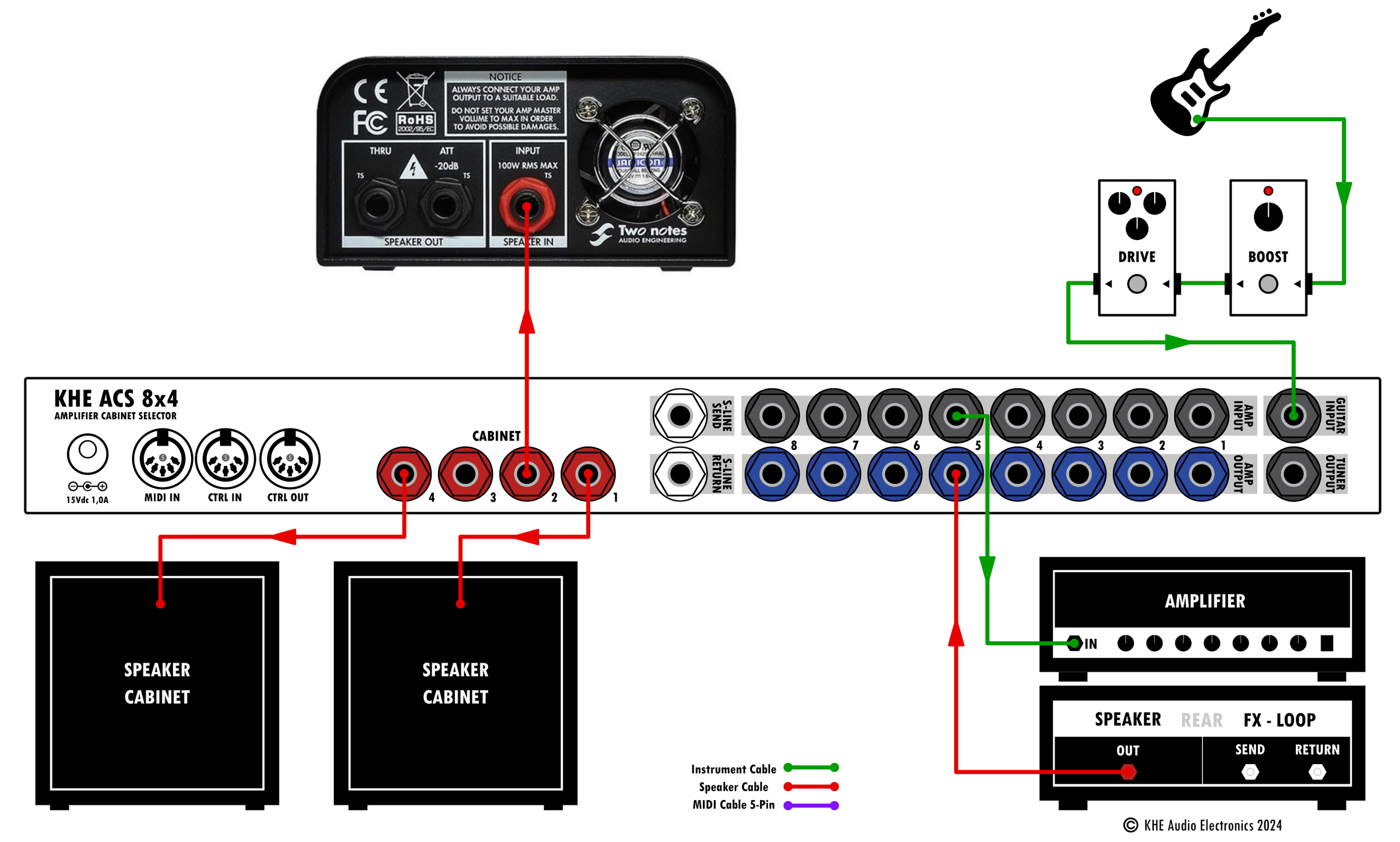 In all scenarios, it is possible to use the line out of the Captor with an audio interface for recording and IR processing. All functions of the Two Notes Captor (X) can be used as normal with the KHE amp switcher.
