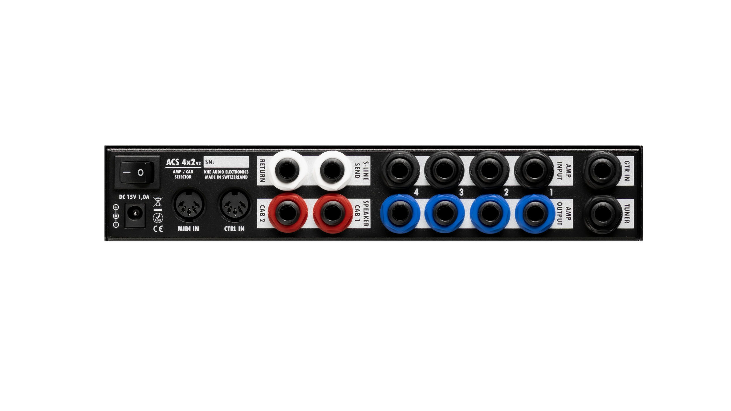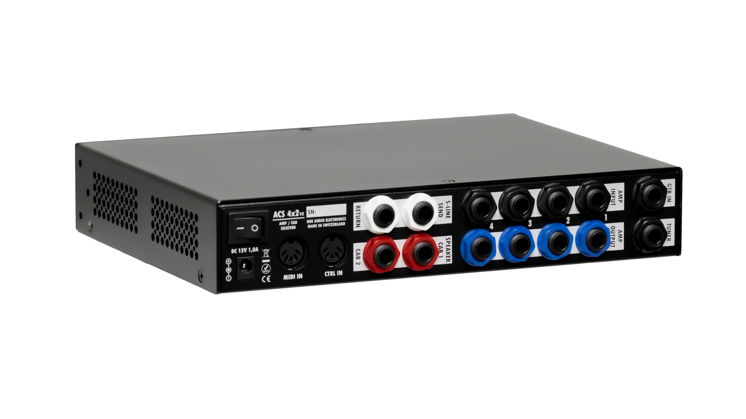 4x2 Switching System for Guitar Amplifiers, Speaker Cabinets and Load Boxes with Attenuator Insert Loop, Dual-Cab Mode, MIDI Control, Link Mode and Rack Mounting Brackets.