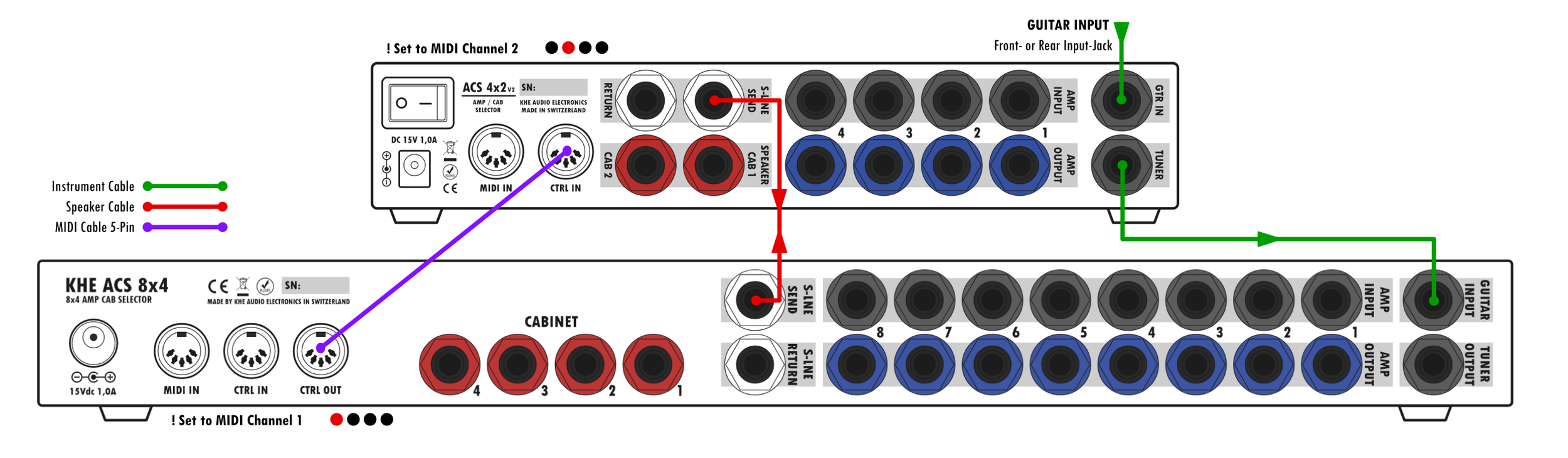 The KHE ACS 4x2 MK-II enables to switch between 4 guitar amps and 2 speaker cabinets or load boxes. Safely switch & play any combination of amps and cabs instantly with a single push of a switch. No more moving heads around or plugging cables. Instant a/b testing and amp shootouts!